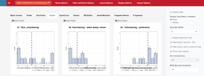 As shown in Fig 3, a smaller screen squeezes the horizontal layout for dyads (and presumably for other signifier types). While we can move to a vertical layout, it is often helpful to see two images alongside each other. Rather than changing the default number across the screen, perhaps the layout options could allow specification of how many to put across the visible screen (or allow the screen to scroll??) - Add "No data" option to Show Counts or Percentages under Display Options